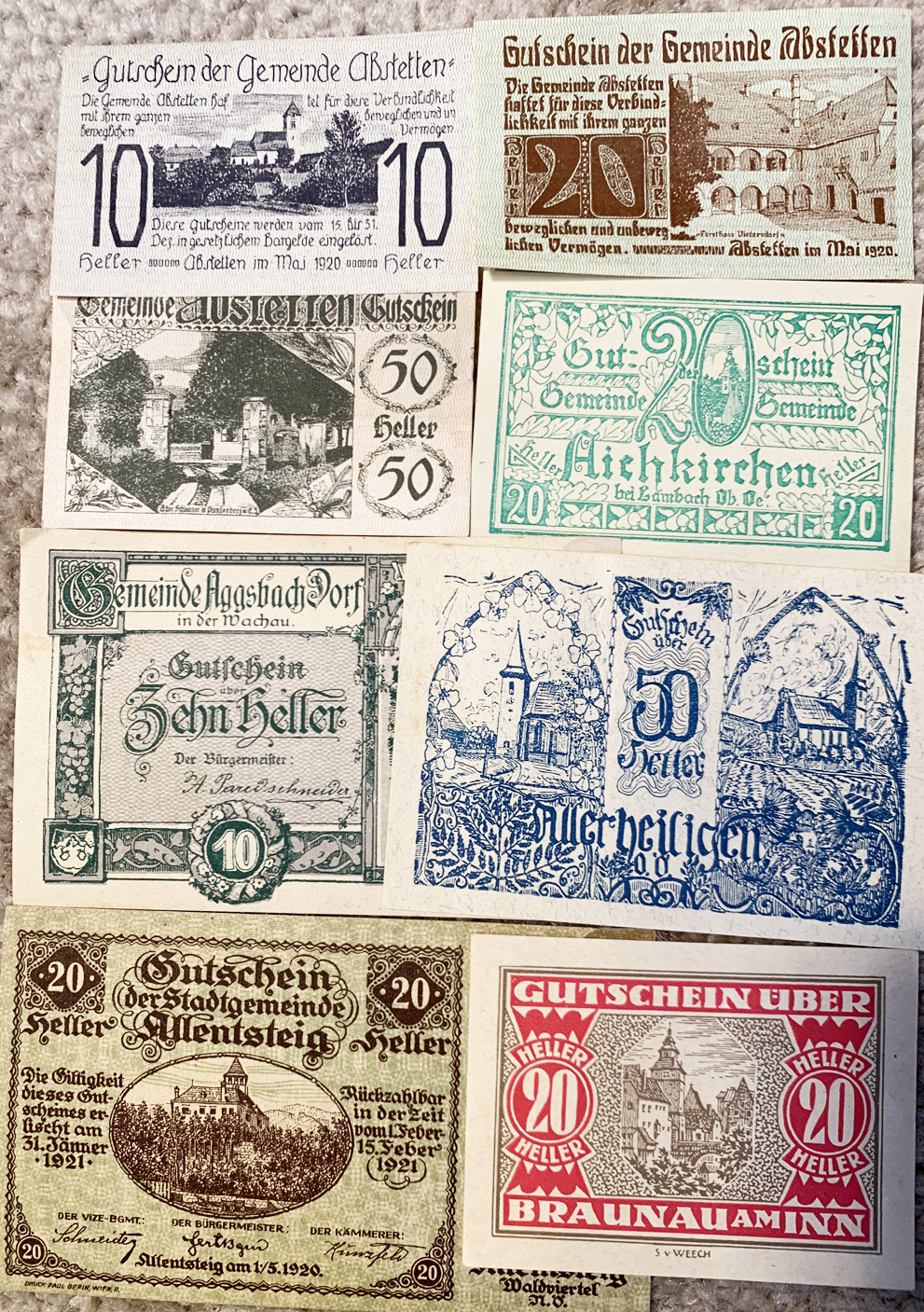 570 AUSTRIAN NOTGELD, 593 diff notes, practically all Unc, nice. Starting Bid $240