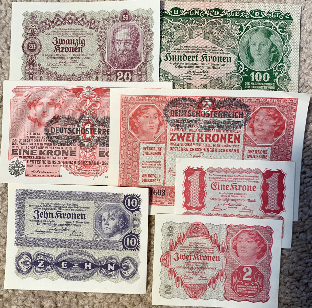 573 AUSTRIA banknotes, 1916-22, 71 pcs, much duplication, only 8 diff, all UNC.